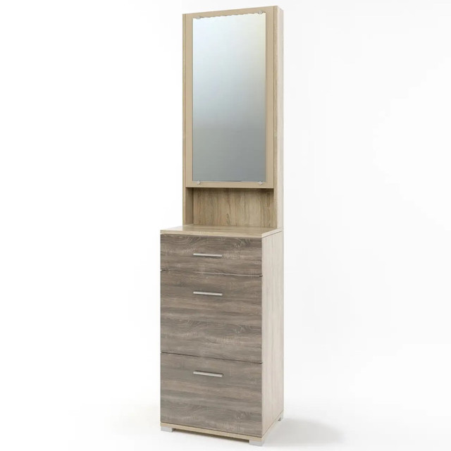 До Вашої уваги пропонується Тумба для взуття із дзеркалом ТО-4 системи Бриз від відомої меблевої фабрики Еверест. Цей виробник давно та міцно завоював серця клієнтів. Тумба виготовлена з міцної ламінованої ДСП за технологією Kronospan (Швейцарія). Товщина ЛДСП 16 мм. Тумба складається з дзеркала, за яким є ніша для дрібниць та ключів, висувної полиці на роликових напрямних та двох ящиків для взуття. Вона відмінно підходить для розміщення взуття та інших речей. Виконана у кольорі дуб сонома-трюфель, що добре вписується в сучасний інтер'єр.