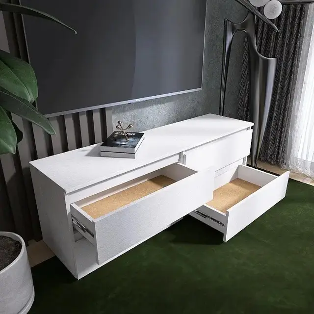 Стильна ТВ Тумба від запорізької меблевої фабрики Еверест виконана з ламінованого ДСП 16 мм, виготовленого за швейцарською технологією Swisspan. Містить чотири просторі ящики на телескопічних напрямних повного відкривання. Має красивий рівний фасад без ручок, для відкриття передбачені зручні внутрішні пази. Органічно впишеться в будь-який інтер'єр завдяки поєднанню трендових кольорів