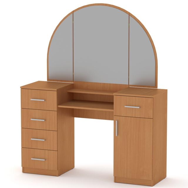 Трюмо від меблевої фабрики Компаніт виготовлено з ламінованої ДСП Swisspan (Швейцарія) завтовшки 16 мм. Має 5 висувних ящиків на роликових напрямних, стіл, відділ з дверима та полицею, а також широке дзеркало з додатковими секціями.