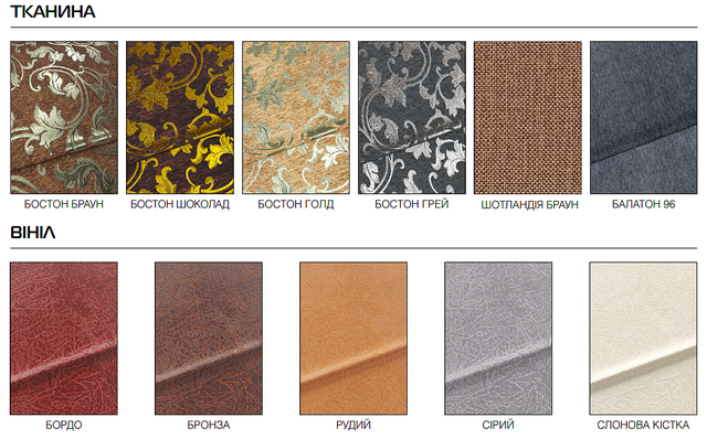 | Оббивний матеріал | Вінілісшкіра, тканина |