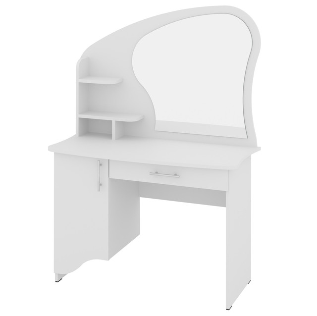Вишукане трюмо від української меблевої фабрики Пєхотін. Модель має міцний корпус, перевірену надійну конструкцію та ексклюзивний дизайн. Містить зручний широкий стіл, відкриті полички, відділ з полицями за дверцятами та широкий висувний ящик на роликових напрямних. Ці меблі вдало впишуться і підкреслять ваш інтер'єр завдяки вибору сучасних кольорів!